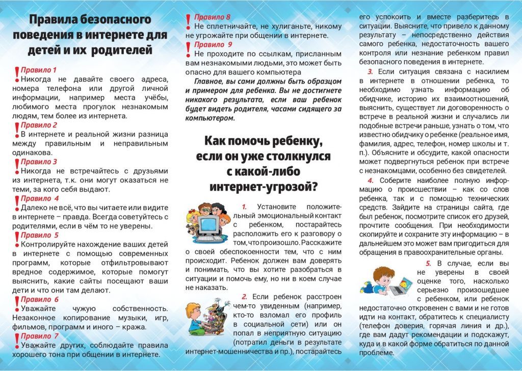 9. Приучите Вашего ребенка сообщать вам о любых угрозах или тревогах, связанных с Интернетом. Напомните детям, что они в безопасности, если сами рассказали вам, о своих угрозах или тревогах. Похвалите их и посоветуйте подойти еще раз в подобных случаях.