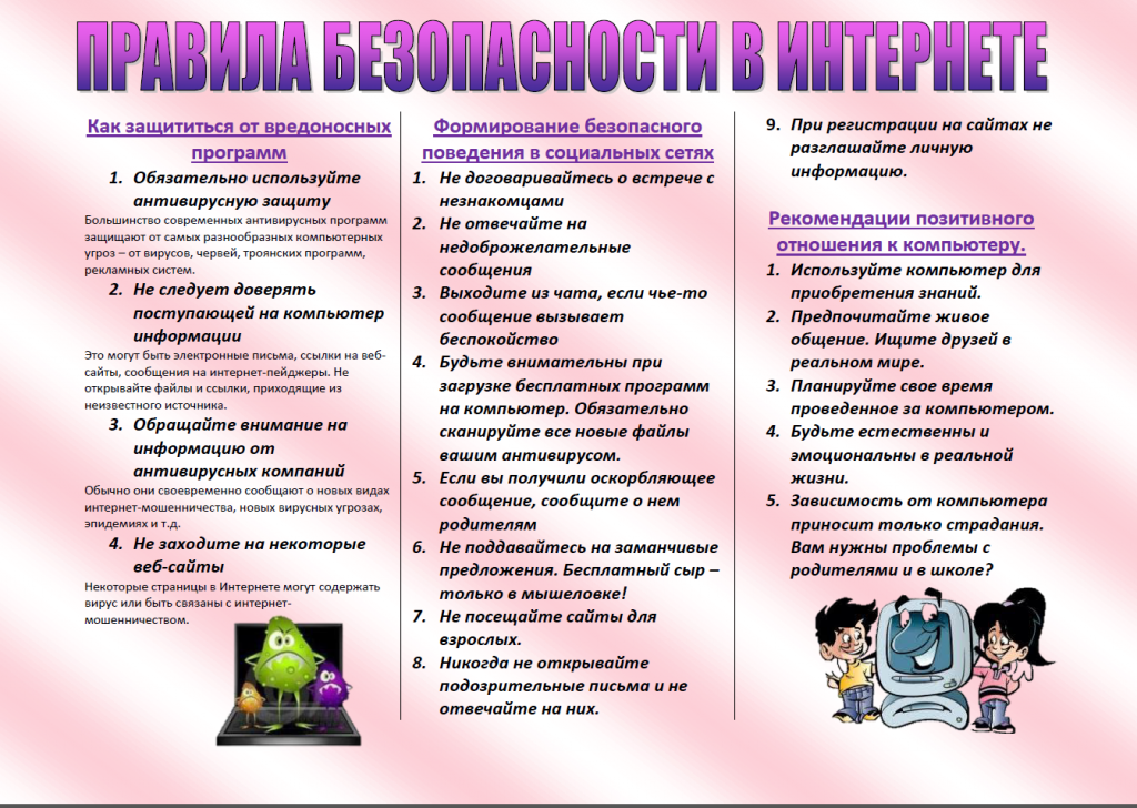 С каждым годом молодежи в интернете становиться больше, а школьники одни из самых активных пользователей Рунета. Между тем, помимо огромного количества возможностей, интернет несет и проблемы. Эта памятка должна помочь тебе безопасно находиться в сети.
